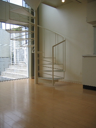 上の階へはこのおしゃれな螺旋階段で