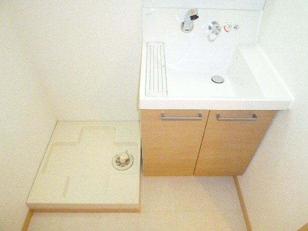 独立洗面台 室内洗濯機置場 その上にはリネン庫