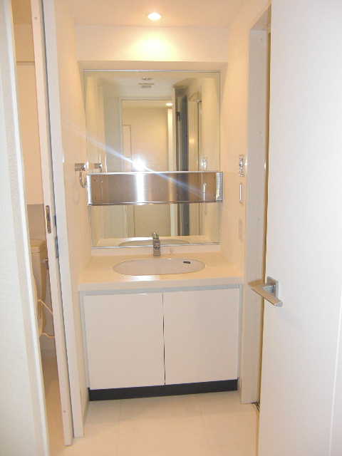 独立洗面台の横にちょっとした収納スペースがあるのがポイントです