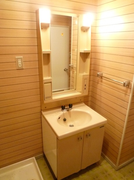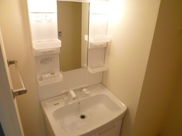 独立洗面台の横にちょっとした収納スペースがあるのがポイントです
