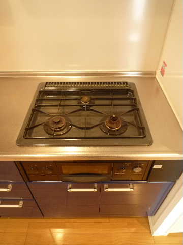 キッチンは、使い勝手も採光なシステムキッチン(ガス3口+グリル)です!!シンクも大きく、お料理好きにはたまりませんね♪