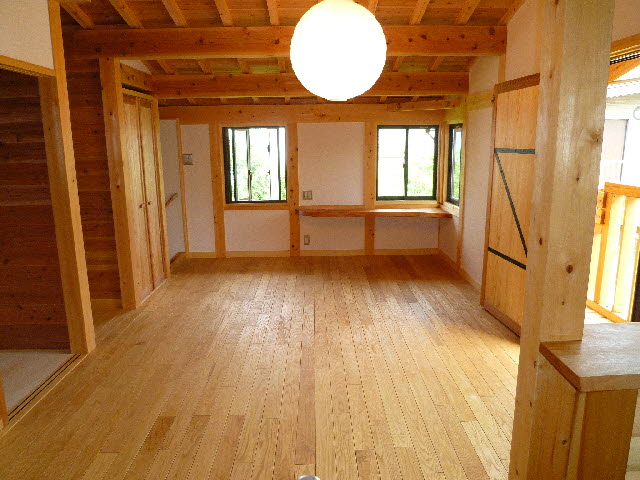 2Fの洋室13.8帖はもちろんこだわりのウッドデッキ仕上げの無垢