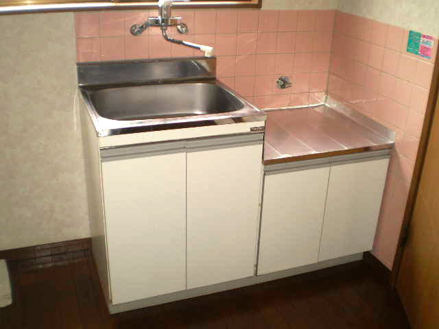 ピンク色のタイルがかわいらしいキッチンです