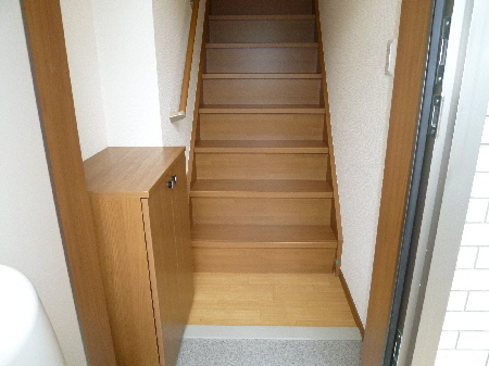 玄関ドアを空けますと、2Fに上がる階段があります