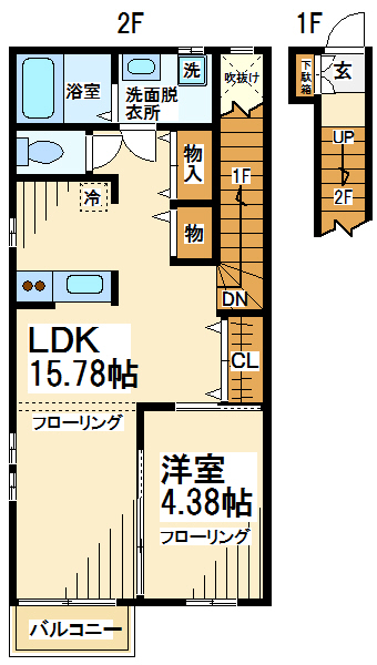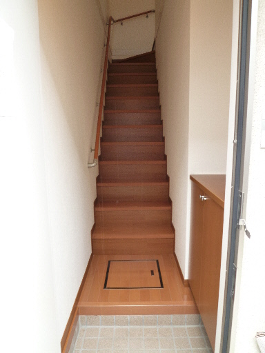玄関から専用階段を上って、お部屋へのアプローチになります!玄関ホールの代わりになり、直接お部屋が見えませんので安心です!