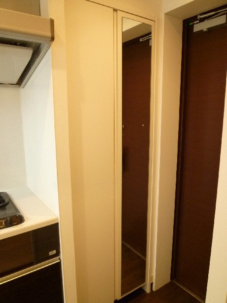 玄関先の姿見は、通りがてらにお出掛け前の最終チェックができて