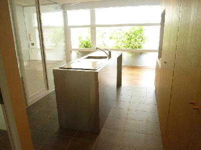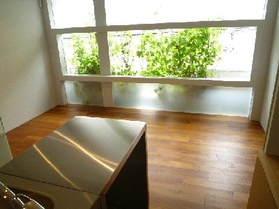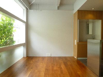 こちらが居室スペースです。窓が大きいので明るく開放感があります。すぐ近くにアイランドキッチンが見えていますが、お料理教室の様ですね。