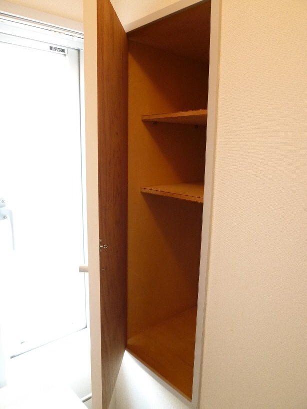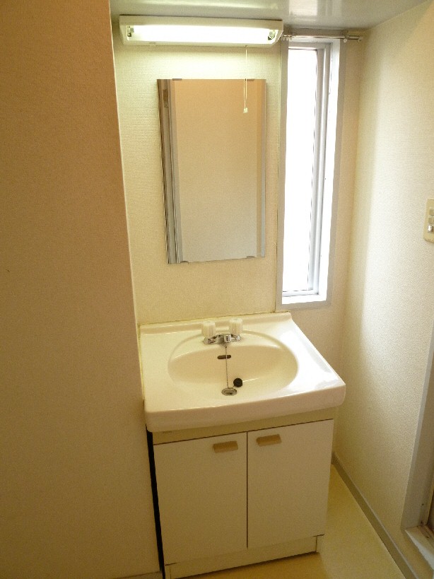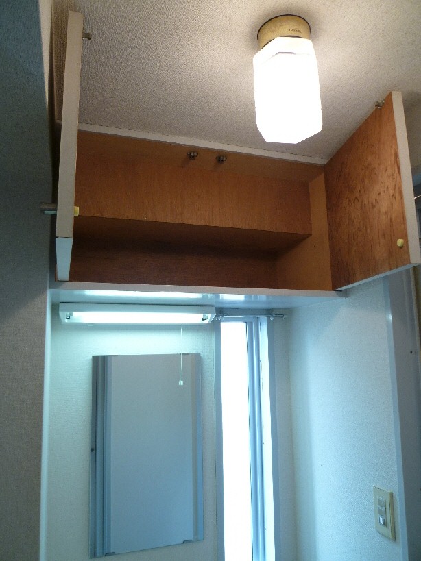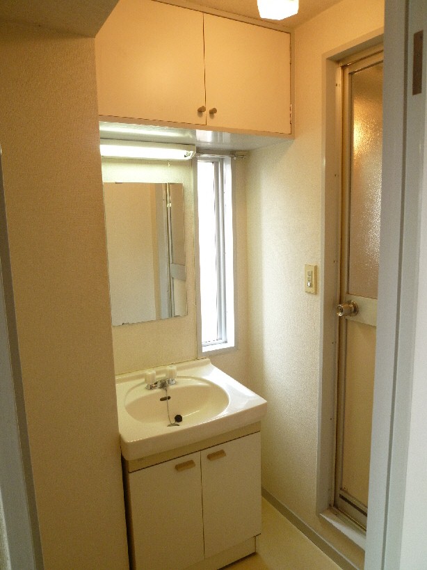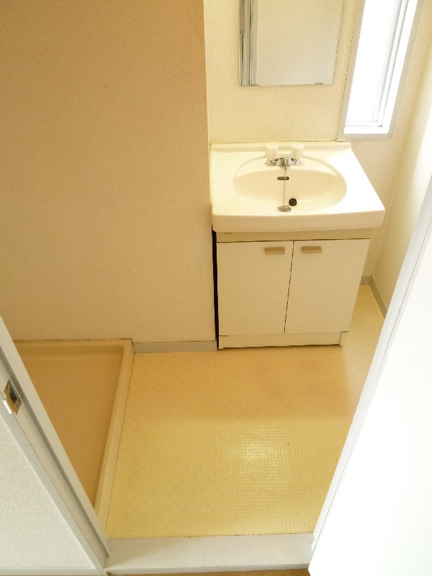 独立洗面台、洗濯機置き場の上部にそれぞれ収納がついておりますので、