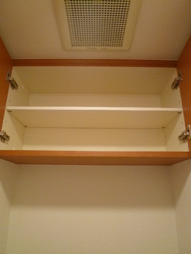 トイレにはトイレットペーパーなどをしまっておける収納棚が付いてます