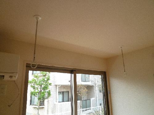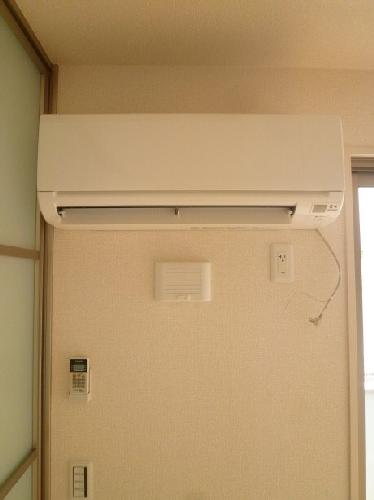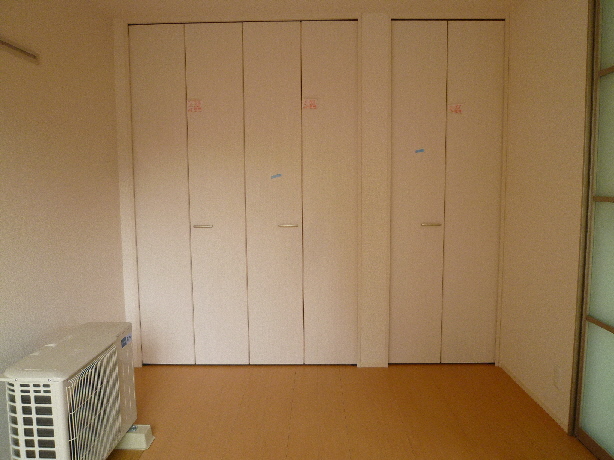 洋室に室外機がありますが、これはまだ建築中だからですのでご安心を