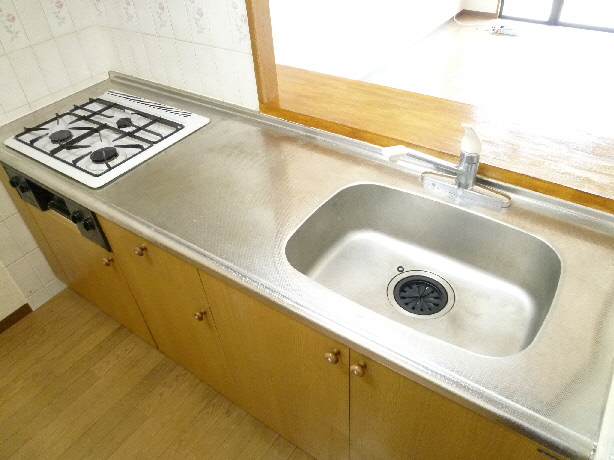 カウンタータイプのキッチン。グリル付きの3口ガスコンロシステムキッチンが入っておりますので、