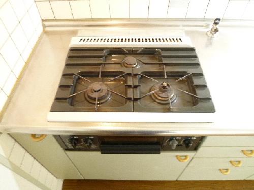 グリル付きの三口ガスコンロは調理スペースがしっかり確保されており、