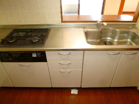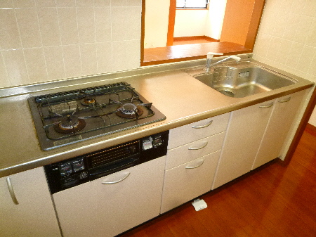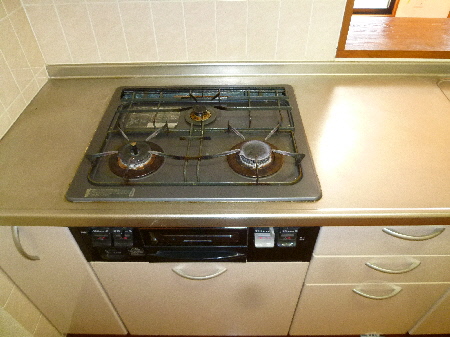 キッチンは3口ガスコンロのシステムキッチンでお魚を焼けるグリルもちゃーんと付いています