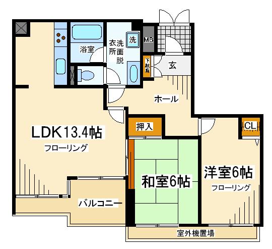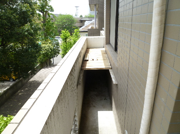 バルコニーと室外機置場です。バルコニーの奥行がかなりあるので