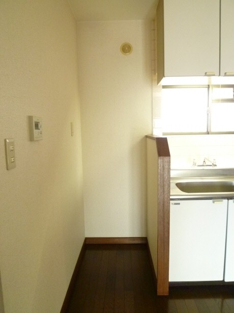 上下の収納スペースが多く、冷蔵庫置場も大き目サイズの設置が可能と、