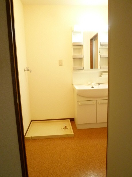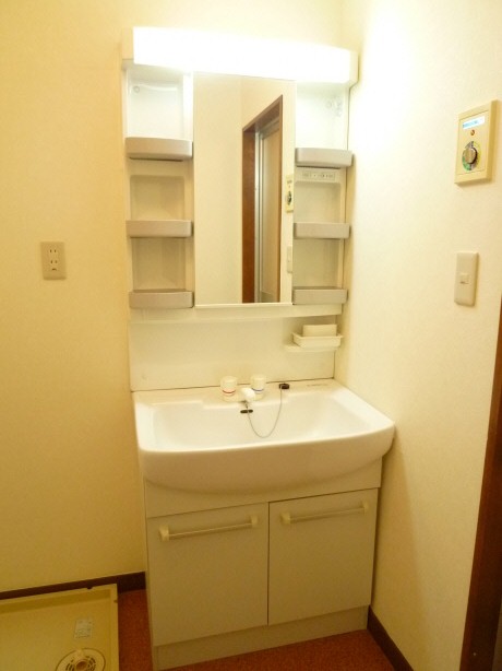 綺麗で小物置き場の多い独立洗面台、室内洗濯機置場があります