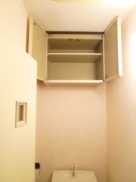 トイレには収納棚がありますので、トイレットペーパーなどを
