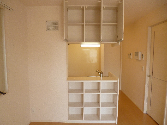 キッチンとリビングの境が収納スペースとなっており、とっても便利です