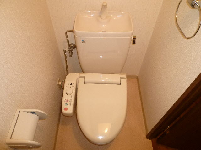 白を基調とした清潔感溢れる感じウォシュレット付き・あれば嬉しい棚付きです