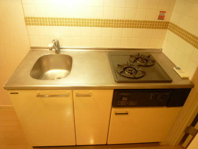 二口のガスコンロ、グリル付き、コンロと流しの間の調理スペースもしっかり取られており、