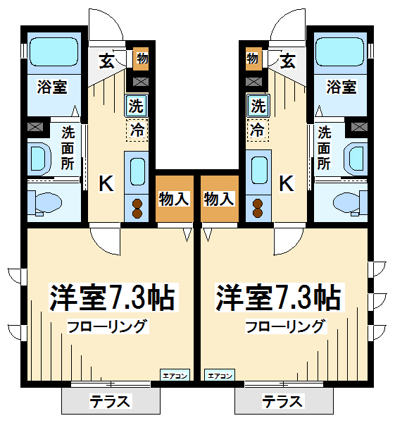 1Fは両部屋共に角部屋になり、それぞれ洋室7.3帖