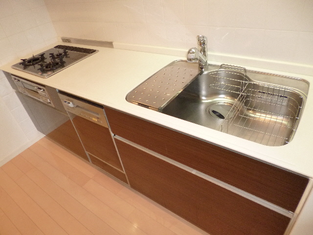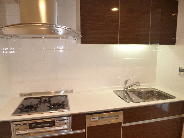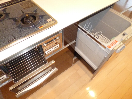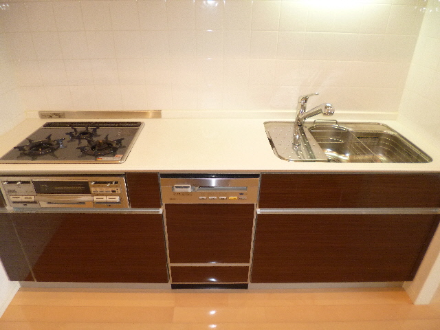キッチンは3口ガスコンロのシステムキッチンで、お魚も焼けちゃうグリルだって付いています