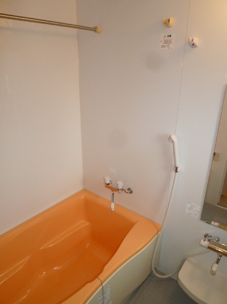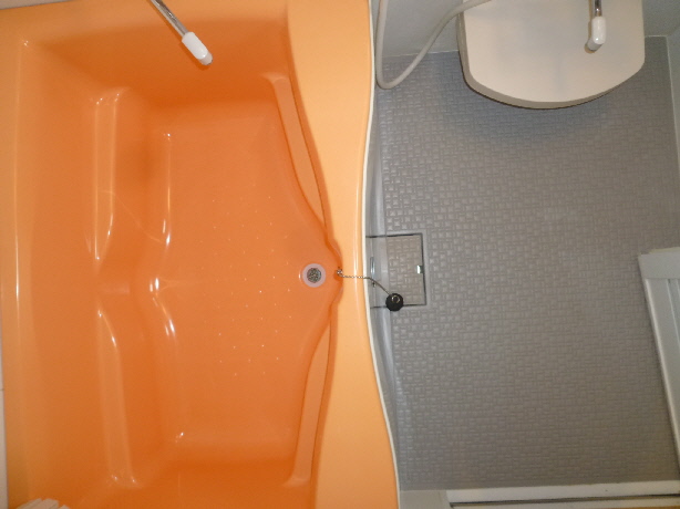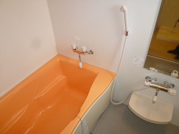 水周りは、脱衣所にしっかりまとまっていて、ビックリしたのがオレンジ色のバスタブ
